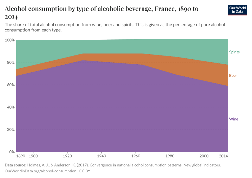 By default, the data for France is shown – in recent decades, here, the share of beer consumption increased to make up around a fifth of alcohol consumption in France.