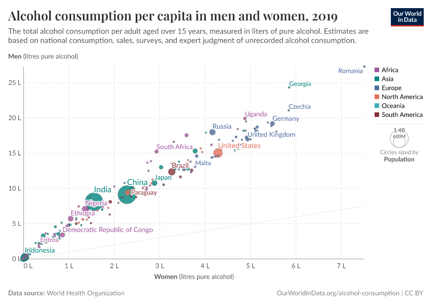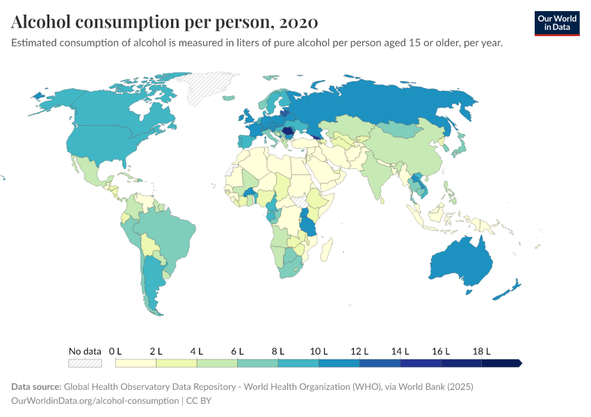 This interactive map shows the annual average alcohol consumption of alcohol, expressed per person aged 15 years or older. To account for the differences in alcohol content of different alcoholic drinks (e.g., beer, wine, spirits), this is reported in liters of pure alcohol per year.