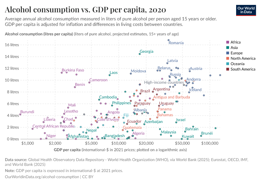 In the chart, we see the relationship between average per capita alcohol consumption – in liters of pure alcohol per year – versus gross domestic product (GDP) per capita across countries.