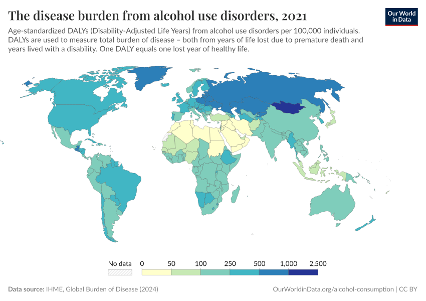 Measuring the health impact by mortality alone fails to capture the impact that alcohol use disorders have on an individual's well-being. The 'disease burden' – measured in Disability-Adjusted Life Years (DALYs) – considers mortality and years lived with disability or health burden. The map shows DALYs per 100,000 people, which result from alcohol use disorders.