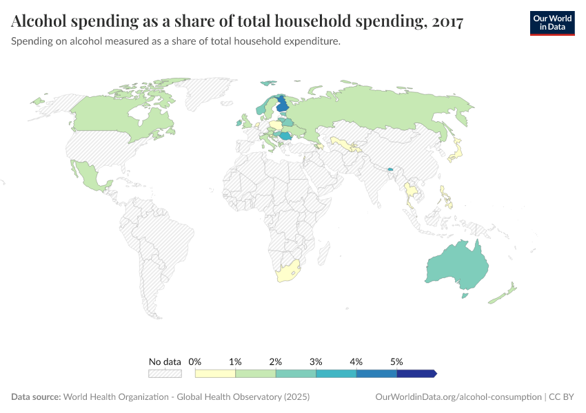 This interactive chart shows the average share of household expenditure that is spent on alcohol.