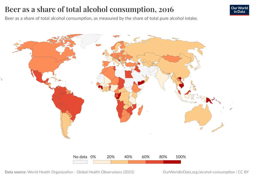 The first map shows this in terms of spirits as a share of total alcohol consumption. In many Asian countries, spirits account for most of total alcohol consumption.
