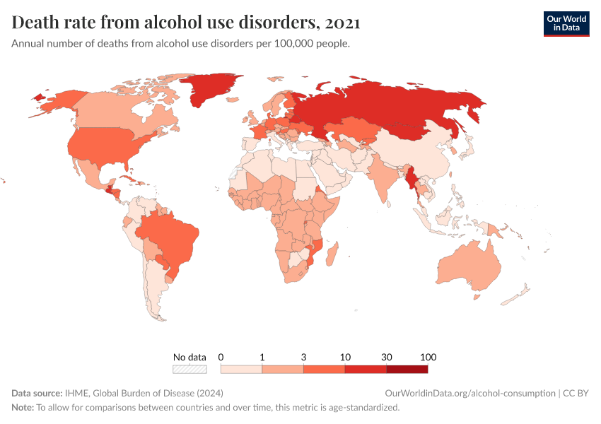 The chart shows direct death rates (not including suicide deaths) from alcohol use disorders across the world. The death rates are typically higher in Eastern Europe and lower in North Africa and the Middle East.