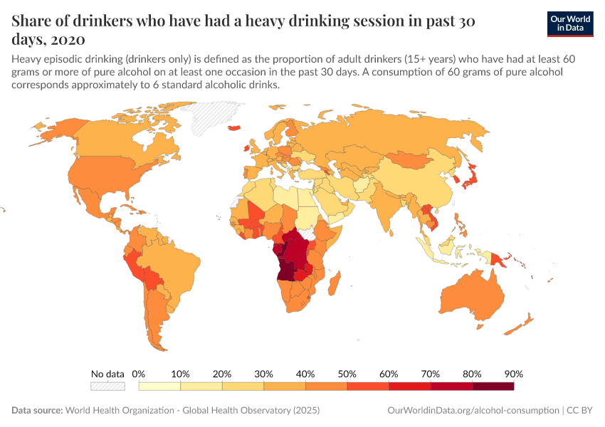 The comparison of this map with the previous maps makes clear that heavy drinking is not necessarily most common in the same countries where alcohol consumption is most common.