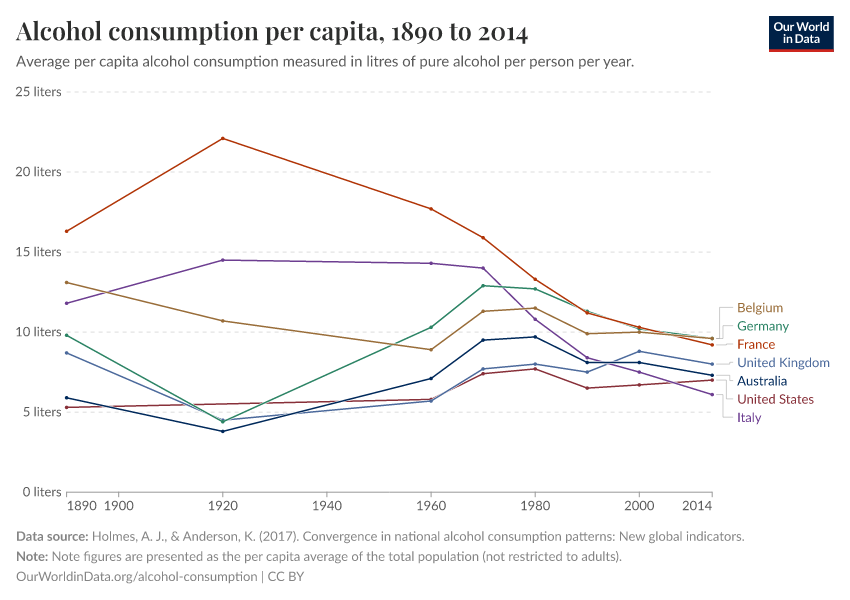 The chart shows alcohol consumption since 1890 in a number of countries.