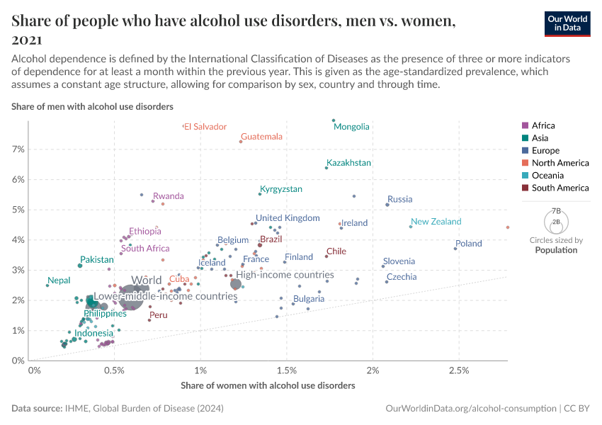 The scatter plot compares the prevalence of alcohol use disorders in males versus that of females. The prevalence of alcohol dependence in men is typically higher than in women across all countries.