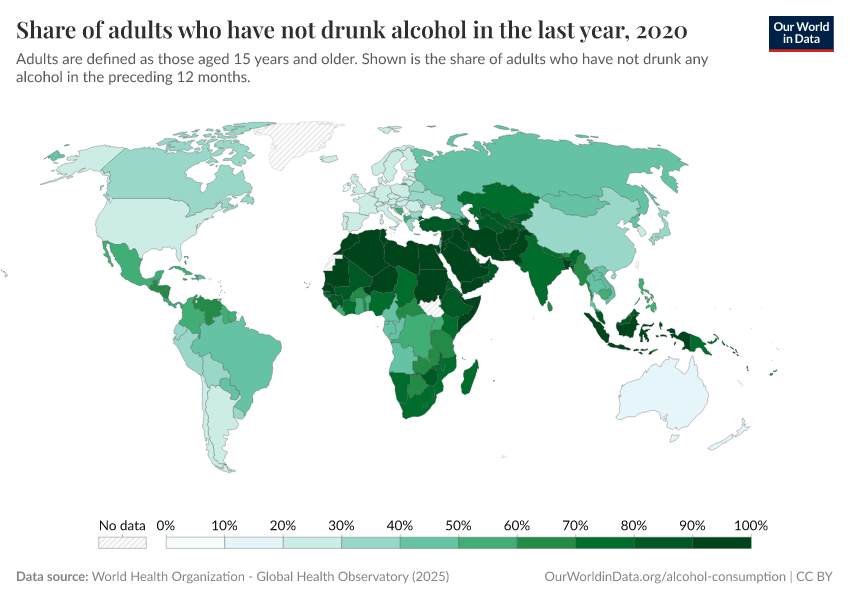 Here, we see particularly high levels of alcohol abstinence across North Africa and the Middle East. In most countries in this region, the majority of adults have never drunk alcohol.
