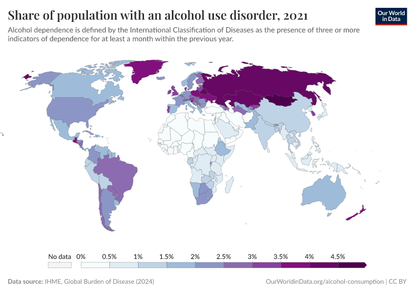 In the chart, we see the prevalence of alcohol dependence versus the average per capita alcohol consumption. There is no clear evidence that high overall consumption (particularly in moderate quantities) is connected to the onset of alcohol dependency.