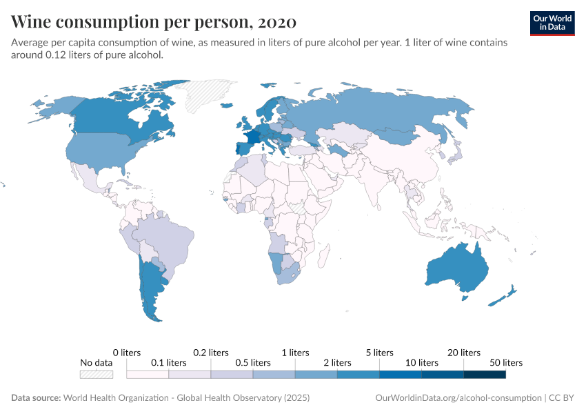 To make this average more understandable, we can express it in bottles of wine. Wine contains around 12% pure alcohol per volume1 so that one liter of wine contains 0.12 liters of pure alcohol. So, a value of 6 liters of pure alcohol per person per year is equivalent to 50 liters of wine. Or, 67 standard bottles of wine (which have a volume of 0.75 liters).