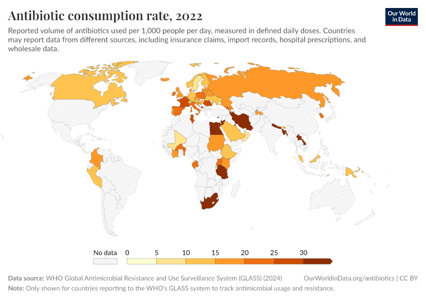 As you can see, the recorded usage of antibiotics varies widely, with high rates in parts of Asia and some countries in Africa and lower rates in parts of Europe. It can be difficult to make direct comparisons with the previous map, which showed antibiotic usage among children from large standardized surveys, while this data comes from a range of sources.