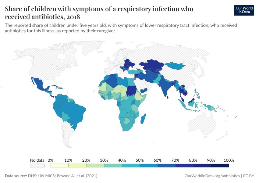 The map below shows the usage of antibiotics to treat children with respiratory infections. Data comes from large-scale surveys such as the DHS and UN MICS.
