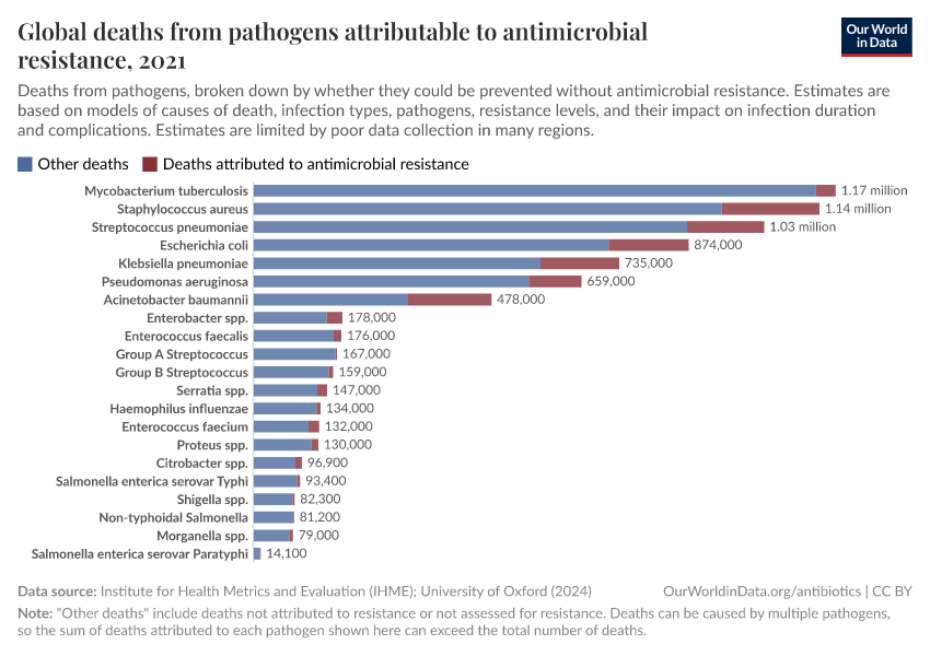 As you can see, deaths caused by antibiotic resistance are most common for bloodstream infections and lower-respiratory infections.