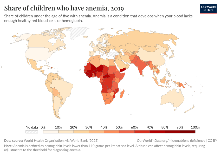 The maps below show the estimated share of children and women of reproductive age who have anemia. It’s much more common in Sub-Saharan Africa and South Asia, where the majority are anemic. But even in richer countries, less than a handful have rates below 10%.
