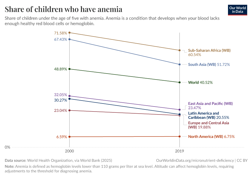 Reductions among children have been slightly more promising: the share of under-fives that are anemic dropped from 48% to 39% between 2000 and 2019.
