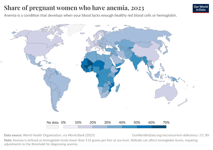 Severe anemia can lead to much more drastic outcomes, though. Anemia during pregnancy can significantly increase the risks of low birthweight babies and, therefore, the risk of infant mortality.2 It also increases the risk of maternal mortality, especially if there is a lot of blood loss during childbirth.3 And anemia in pregnant women is extremely common, especially in lower-income countries. You can see this in the map: in some of the poorest countries, more than half of pregnant women are anemic.