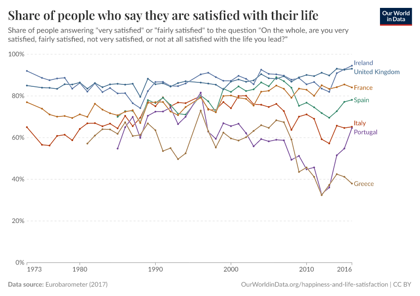 L'Eurobaromètre, sous l'égide de la Commission européenne, collecte depuis 1974 des données sur la satisfaction de vie au sein de grandes enquêtes d'opinion. Pour certains pays, ces enquêtes ont été menées annuellement depuis plus de 40 ans. Le graphique ci-dessous montre, comme précédemment, la part des personnes se disant “très satisfaites” ou “assez satisfaites” de leurs conditions de vie.