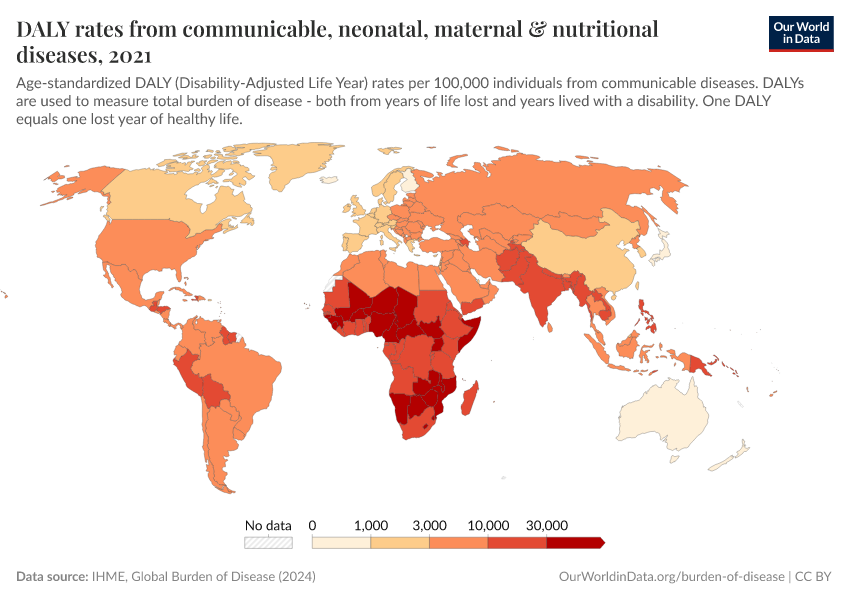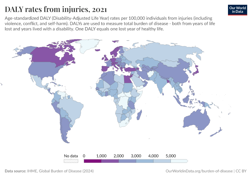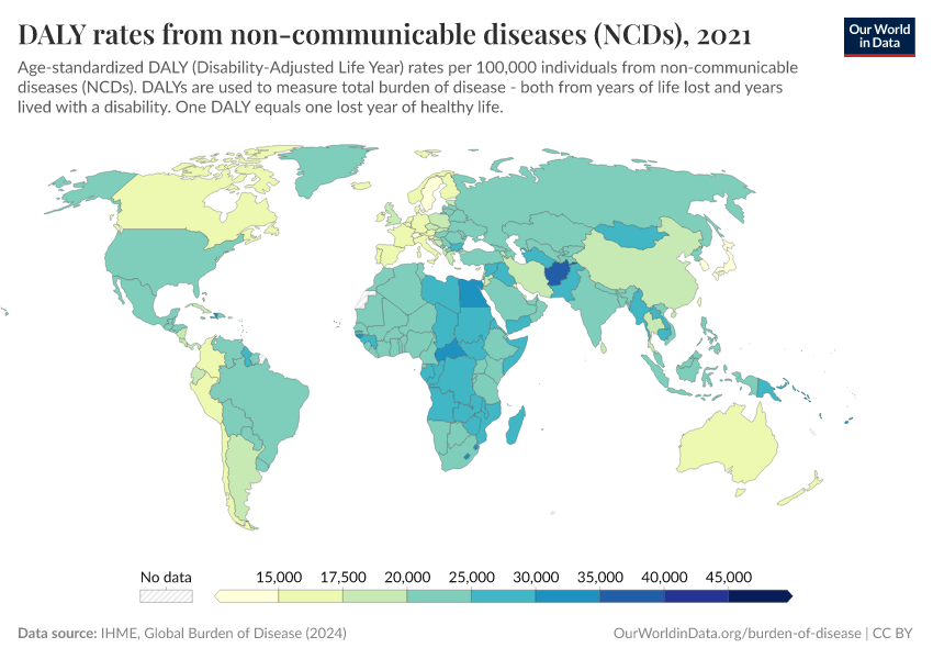 This map shows the annual rate of DALYs per 100,000 people in the population. It is thereby measuring the distribution of the burden of both mortality and morbidity around the world.