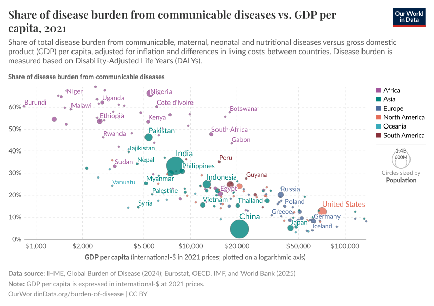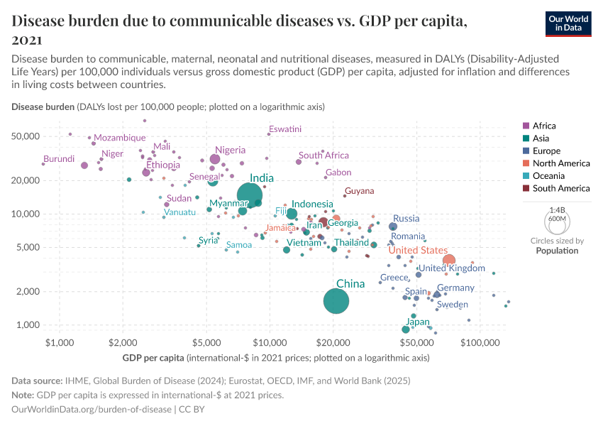 The burden of disease due to communicable diseases vs GDP per capita is shown in the following charts.