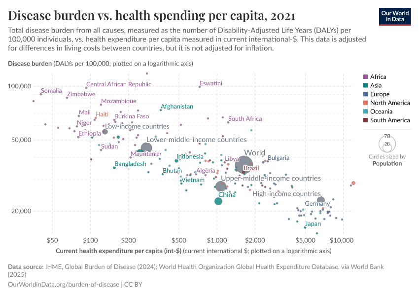 The chart below shows the relationship between the total burden of disease versus average health expenditure per person, measured in US dollars.