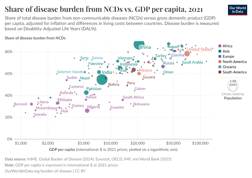 However, NCDs also constitute a higher share of disease burden at higher incomes. This is because communicable diseases decline more greatly with income than non-communicable diseases do.