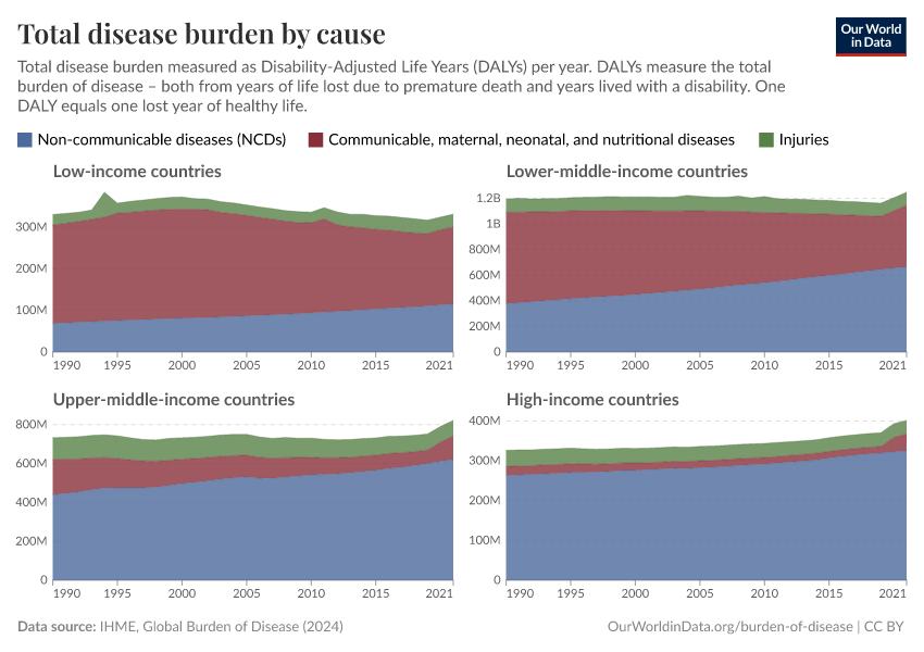 Epidemiologists break the disease burden down into three categories of disability or disease: non-communicable diseases (NCDs); communicable, maternal, neonatal, and nutritional diseases; and injuries. These are shown in the chart below.