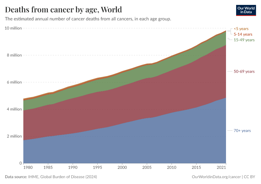 The world has seen a rise in cancer deaths over time, as the chart below shows. This comes largely from more deaths in the oldest age groups as populations have been growing and aging.