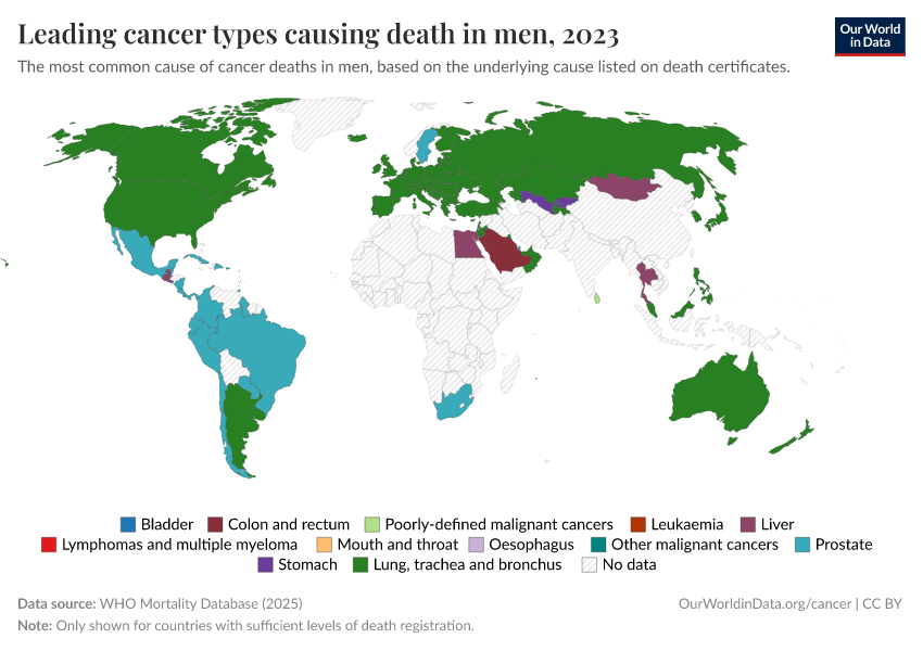In men, you can see that lung cancer kills the most in many countries. Other cancers — such as prostate, liver, and stomach cancer — are the most common in others.