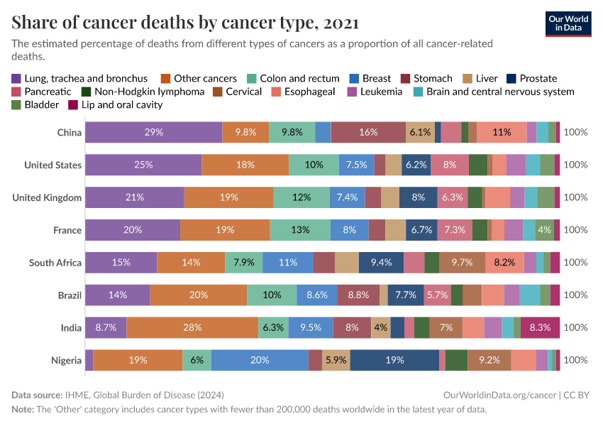 The share of cancer deaths from each type varies between countries. You can explore an interactive chart for different countries showing the relative share of all cancer deaths from each cancer type here: