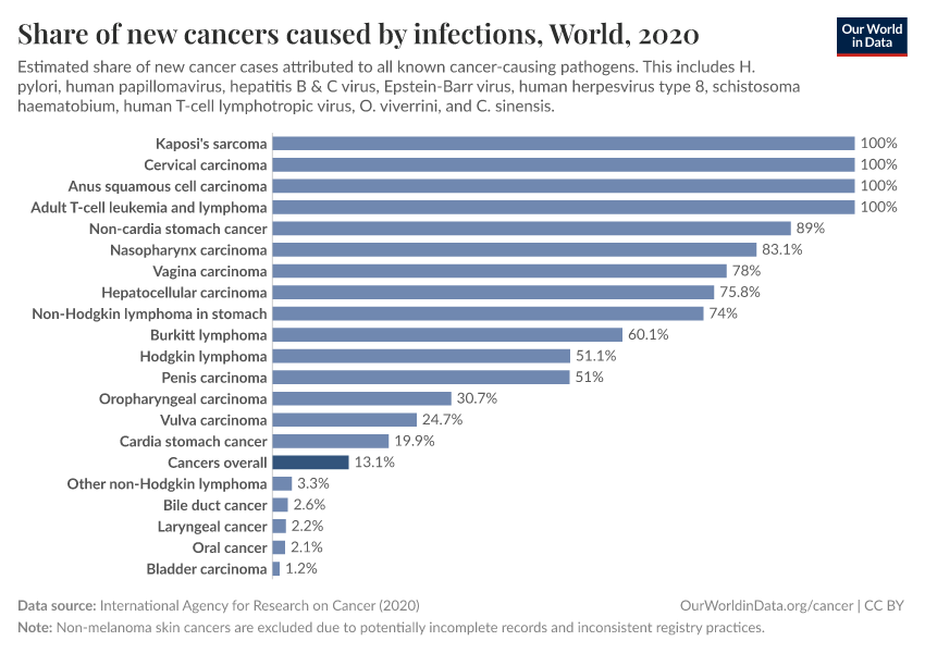 You can see that, for some cancers — such as Kaposi’s sarcoma, cervical cancer, T-cell leukemia and lymphoma, and non-cardia stomach cancer — it’s estimated that all, or almost all, cases are caused by pathogens.