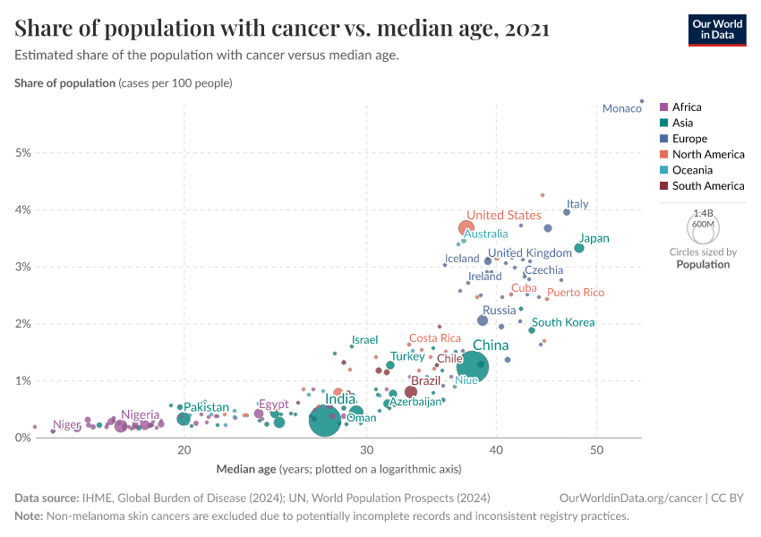 These factors mean that countries with older populations tend to have a higher prevalence of cancer. This is shown in the chart below.