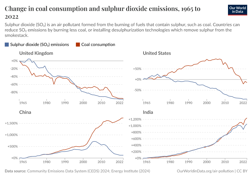 The United Kingdom did a mix of both. Its coal burning has fallen rapidly since the 1960s. Look at the two charts below: by 2022, coal consumption had fallen by 96% and sulfur dioxide emissions by more than 99%.