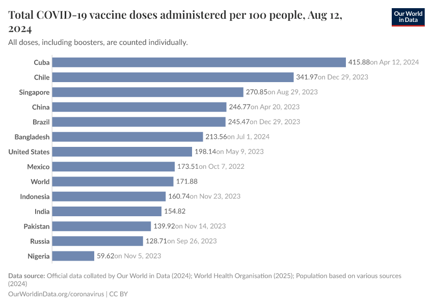 The following map and chart show the number of vaccine doses administered per 100 people within a given population. Each dose, including boosters, is counted as an individual dose.
