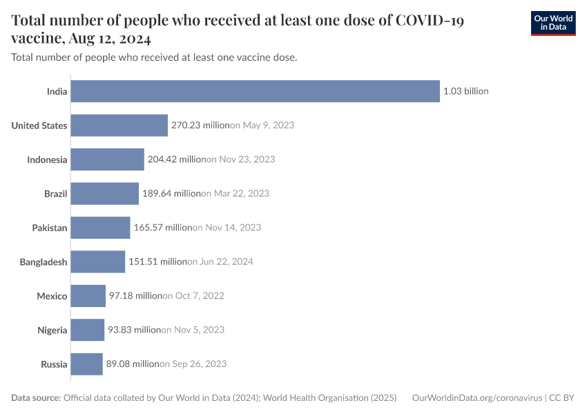 The following charts show the total number of people who have received at least one dose of the COVID-19 vaccine. This may not be equivalent to the number with a complete initial protocol if the vaccine requires two doses.