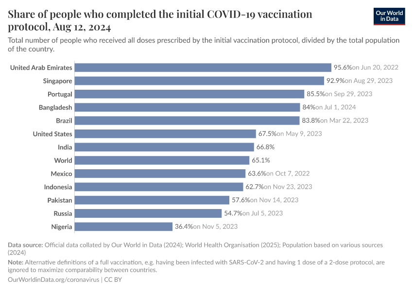 The following chart shows the share of the total population that has completed the initial vaccination protocol.