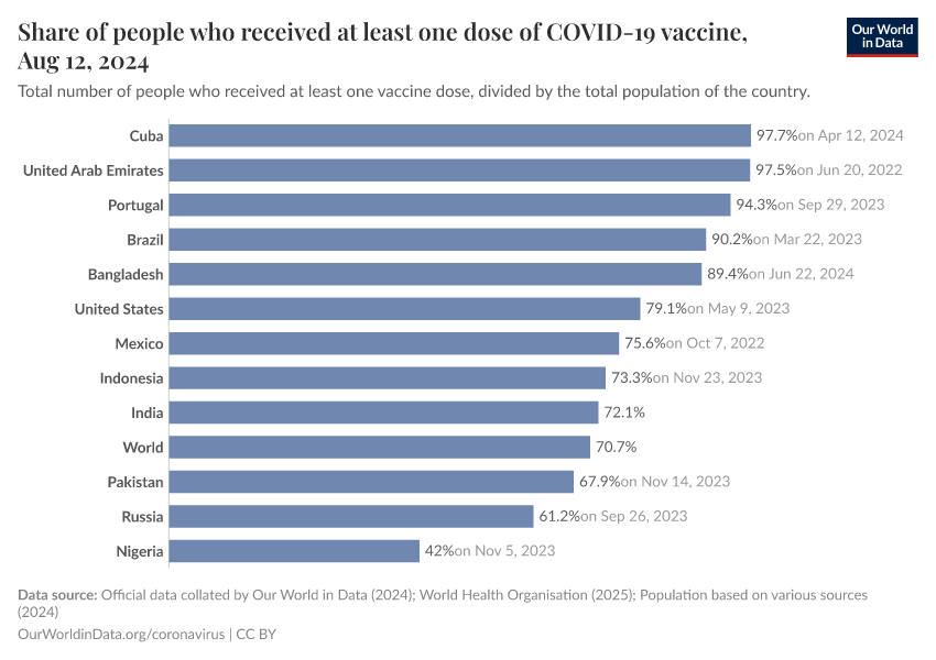 The following charts show the share of the total population that has received at least one dose of vaccine. This may not be equivalent to the share with a complete initial protocol if the vaccine requires two doses.