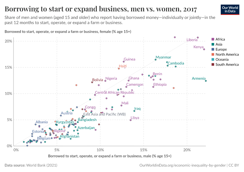 Above we show that there are large gender gaps in land ownership across low-income countries. Here we show that there are also large gaps in terms of access to borrowed capital.