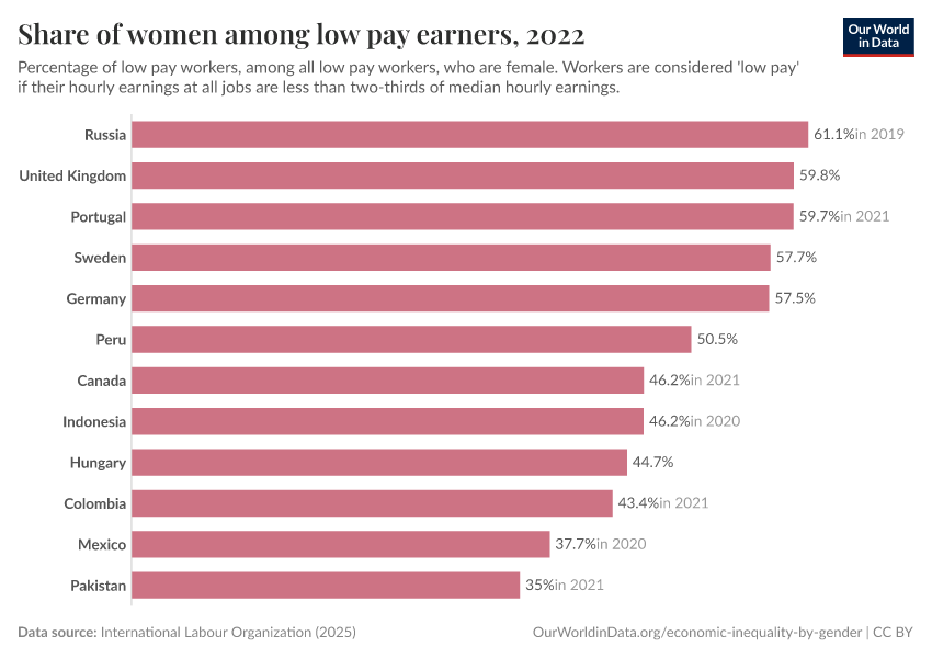 Above we show that women all over the world are underrepresented in high-profile jobs, which tend to be better paid. As it turns out, in many countries women are at the same time overrepresented in low-paying jobs.