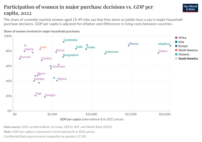 In this chart, we plot the share of currently married women who report having a say in major household purchase decisions, against national GDP per capita.