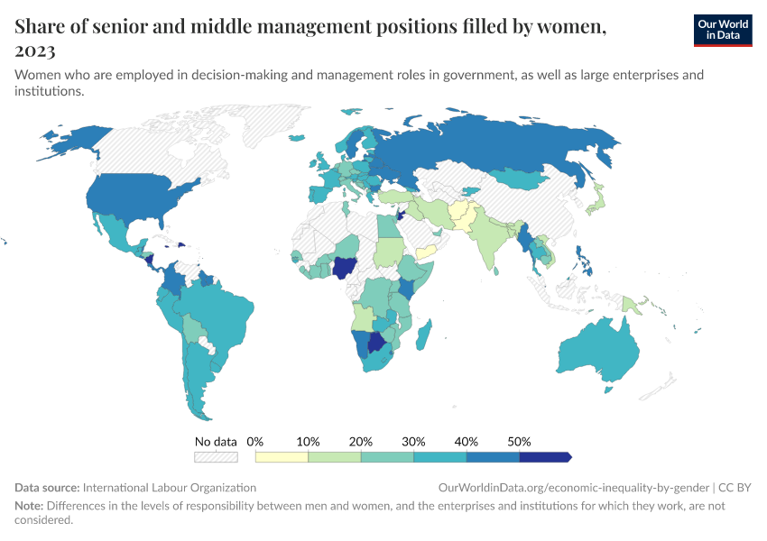 The chart here plots the proportion of women in senior and middle management positions around the world. It shows that women all over the world are underrepresented in high-profile jobs, which tend to be better paid.