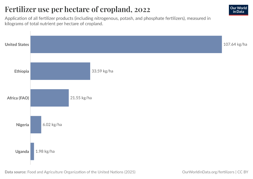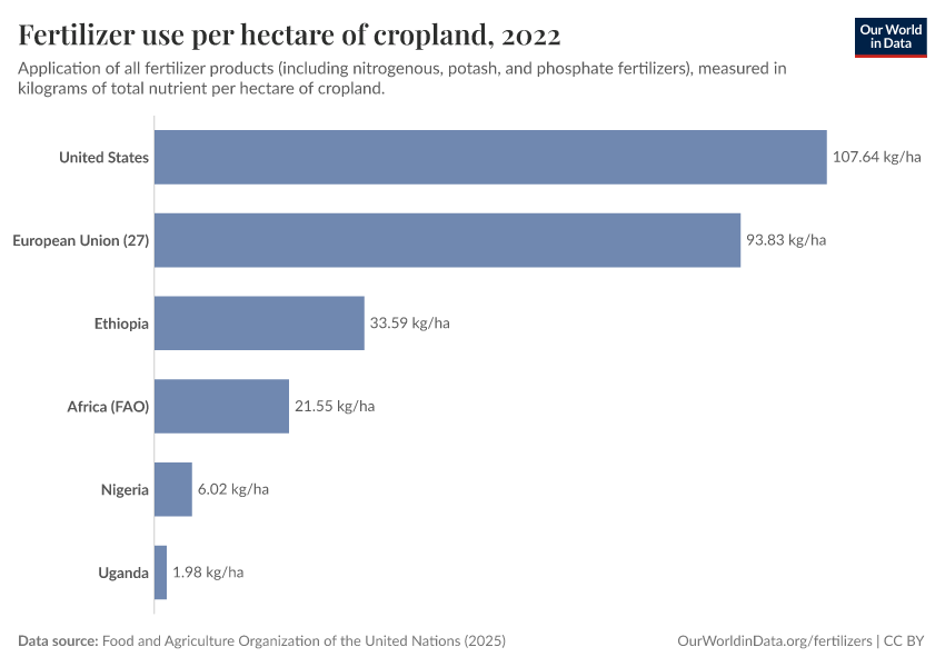 The European Union and the United States use about five times as much fertilizer per hectare as the African average. Within Africa, many countries use much less than this — as little as a few kilograms per hectare. Some lower-income countries use almost no fertilizers or pesticides and have little to regulate. This is shown in the chart below.