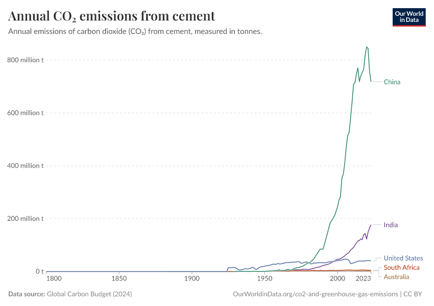 This interactive chart shows per capita CO2 emissions from cement production, measured in tonnes per person per year.