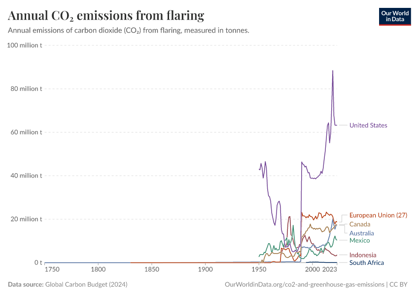 This interactive chart shows annual emissions from gas flaring by country, over time.
