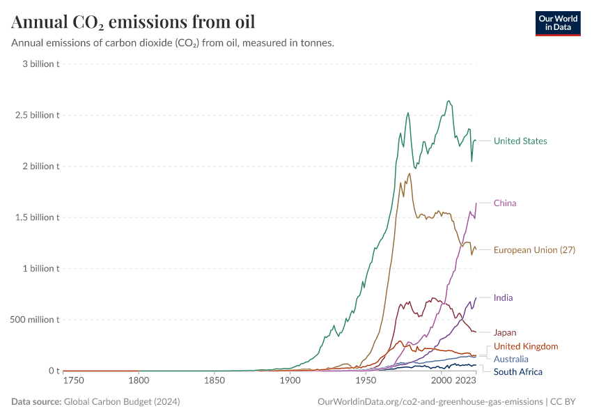 This interactive chart shows per capita CO2 emissions from oil, measured in tonnes per person per year.
