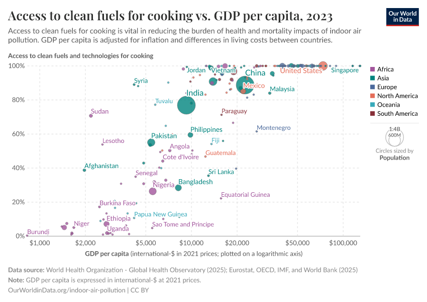 The map shows the share of households with access to clean fuels and technologies for cooking across the world. This share has been increasing for most countries with low-to-middle incomes; however, rates of increase vary by country and region.