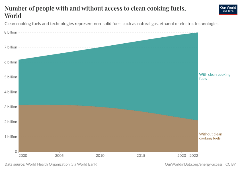 The total number of people globally without clean cooking fuels has slowly declined since 2000.