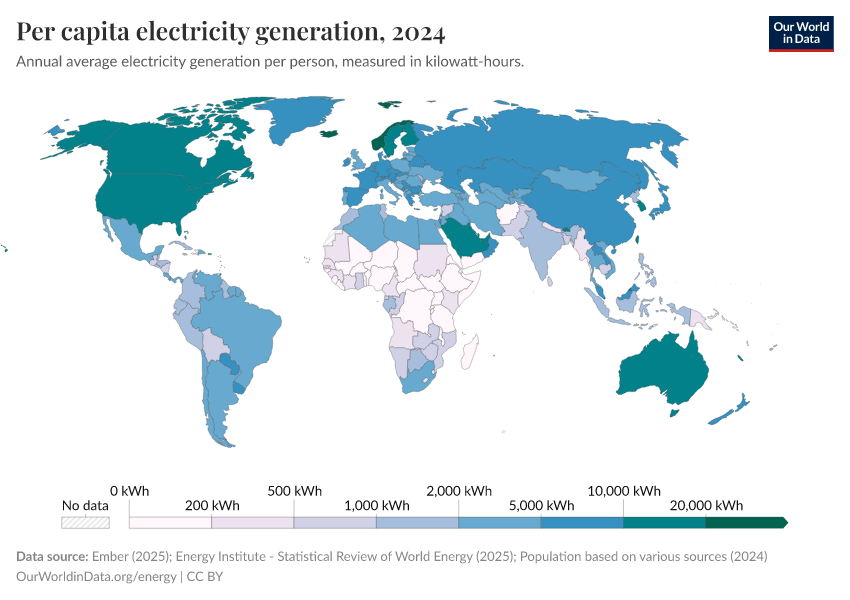 The map shows the differences in average per capita electricity generation across the world.