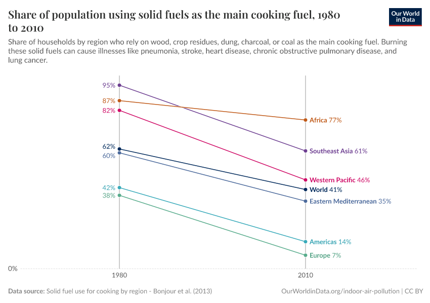 The use of solid fuels is declining in all of the world’s regions. However, the success of rapidly developing Southeast Asia is particularly impressive. Here, there has been a remarkable decline in the use of solid fuels, shifting from nearly all of the population to just over half.
