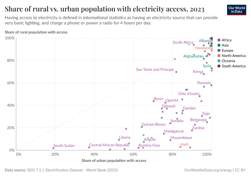 Countries below the grey line have lower access for rural populations than urban areas. Nearly all of these lines lie below this line, meaning that electricity access in urban areas is higher for most nations than in rural regions.