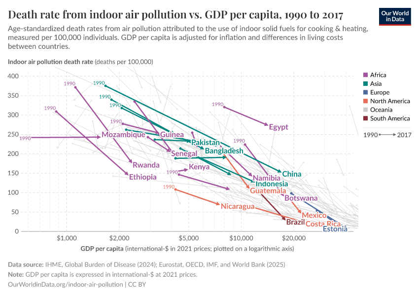 The world is solving this problem. We see this in the chart. Strong economic growth made people around the world richer, and the death rate from indoor air pollution declined.