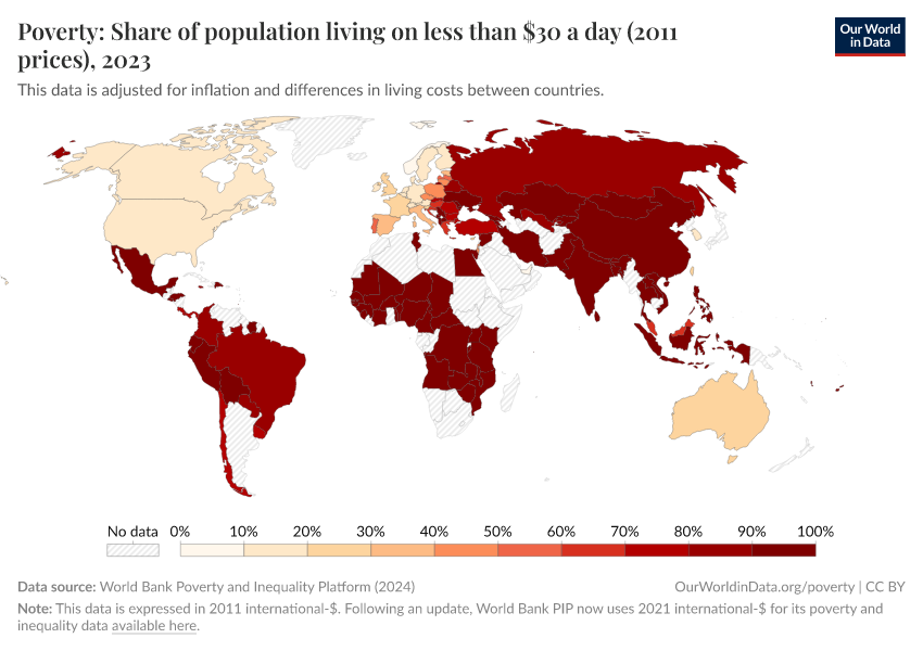 In the map below, and in all international poverty statistics on Our World in Data, the data is adjusted for inflation and cross-country differences in the price level. The expandable section below the map provides a more detailed explanation of how.